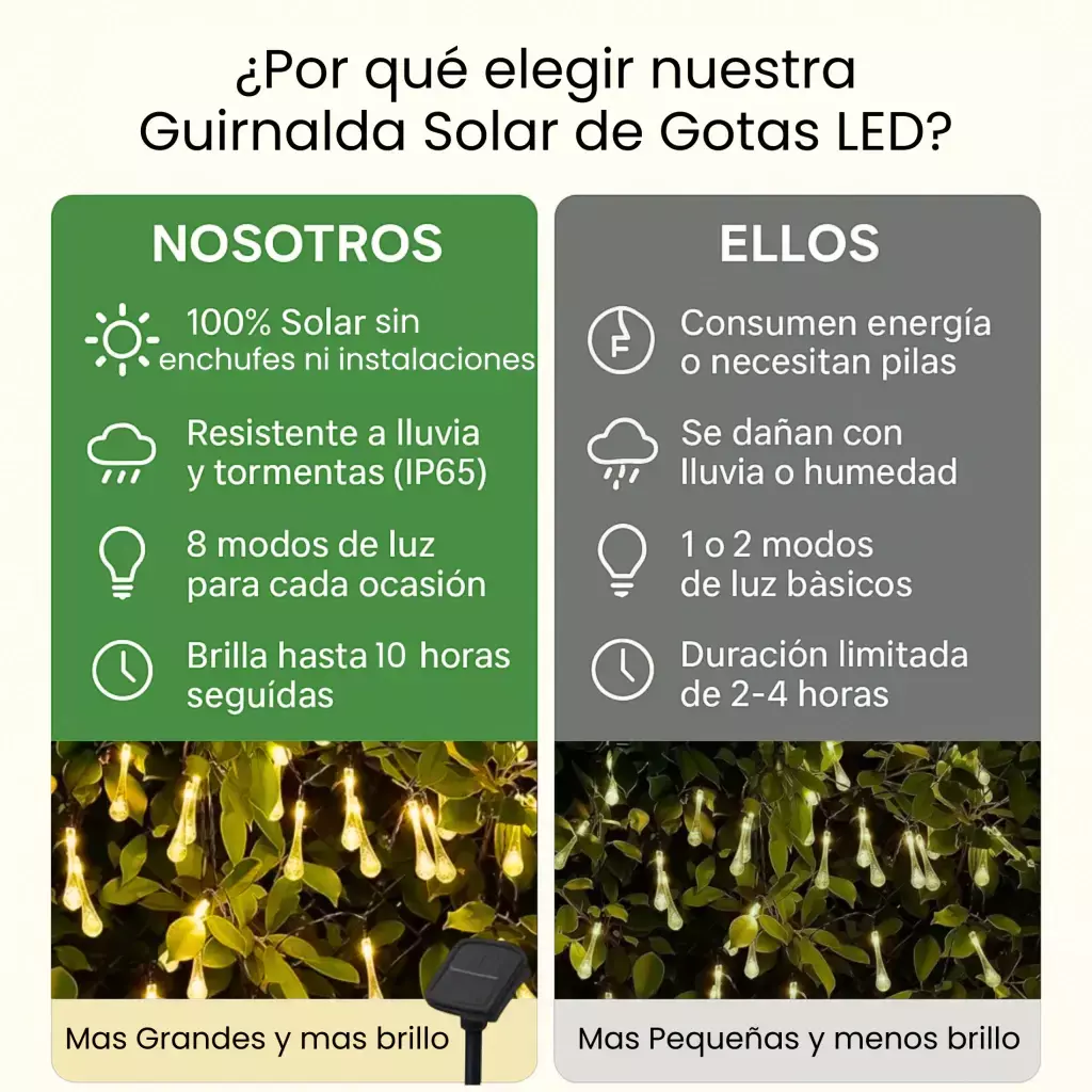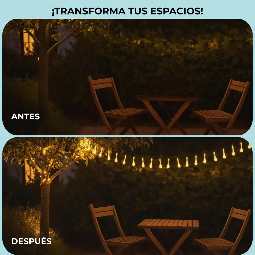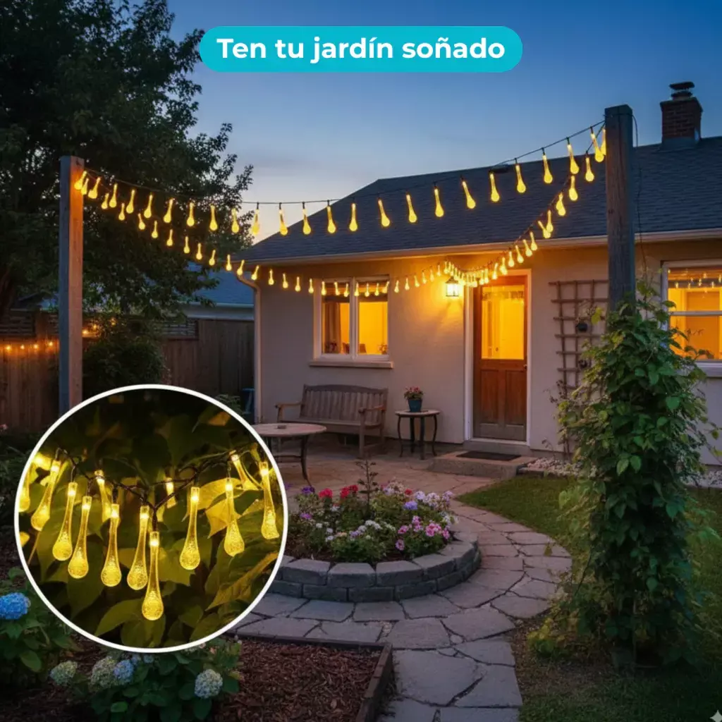 Imaginá noches de verano perfectas, cenas al aire libre o un rincón acogedor en tu balcón, todo iluminado con una luz cálida y mágica, **sin gastar un peso en electricidad.** Nuestras guirnaldas solares de gota son la solución.